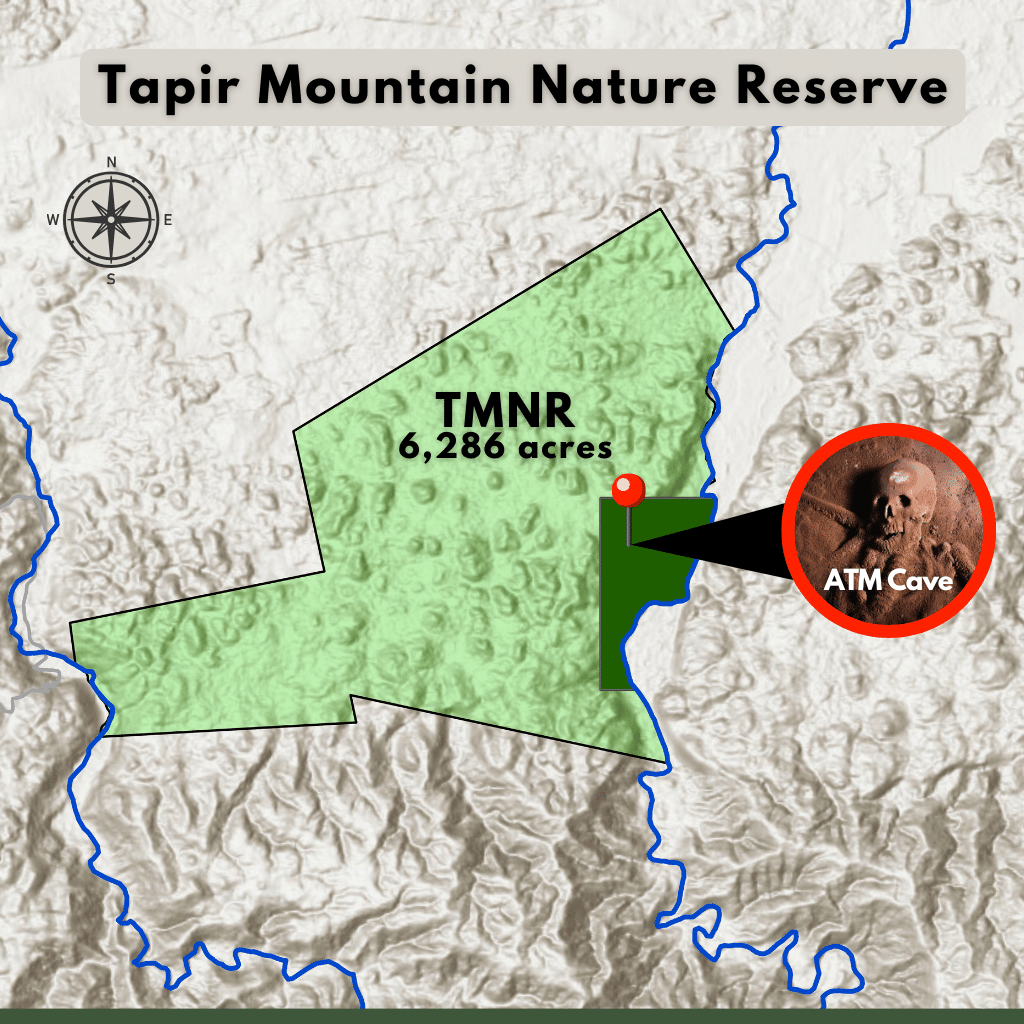 Tapir Mountain Nature Reserve (TMNR), Belize’s very first nature reserve, comprises 6,286 acres of pristine lowland tropical evergreen forest on limestone (karstic) soils. Nestled in the lowland foothills below the north-facing escarpment of the Maya Mountains Massif, it is located a mere eight miles southwest of Belmopan, Belize’s capital, and five miles south of the Western Highway corridor that connects Belize City with the Guatemalan border. TMNR lies entirely within the Belize River watershed and provides significant protection of the Barton Creek and Roaring Creek sub-watersheds. Barton Creek partially defines TMNR’s western boundary and Roaring Creek its eastern boundary. The undisturbed forested landscapes of TMNR drain into these two creeks, providing a significant watershed buffer for the downstream communities of Teakettle, Ontario, and Blackman Eddy.
